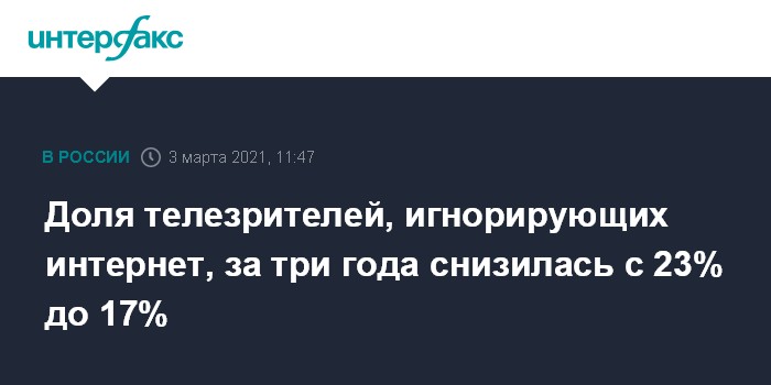 Москва. 3 марта. INTERFAX.RU - В России по сравнению с 2018 годом доля тех, кто активно смотрит телевизор (не меньше нескольких раз в неделю), но почти не пользуется интернетом, снизилась с 23% до 17%, показали опросы ВЦИОМа.