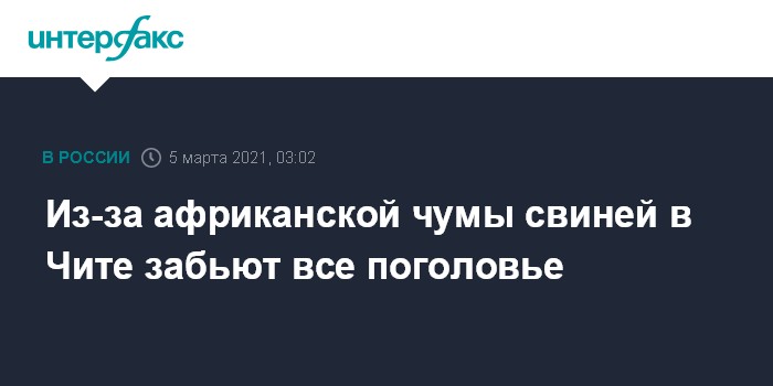 "Забайкальская краевая ветеринарная лаборатория 3 марта выявила африканскую чуму свиней в одном из личных хозяйств на территории города Читы. (...) Из-за высокой скорости распространения вируса необходимо ликвидировать всех свиней на территории города Читы и Читинского района", – говорится в сообщении.