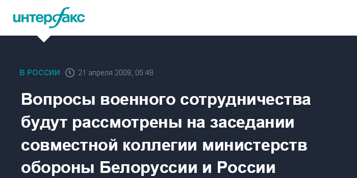 Москва. 21 апреля. ИНТЕРФАКС-АВН - Заседание совместной коллегии министерств обороны Белоруссии и России пройдет во вторник в Минске.