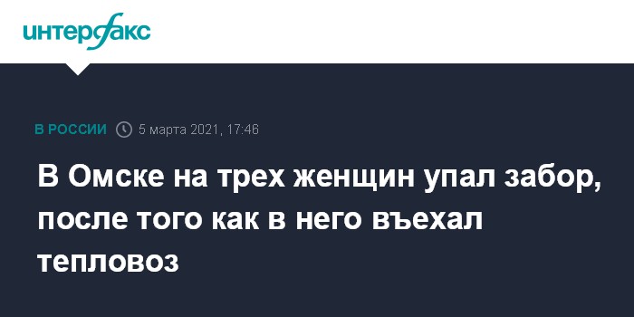 Москва. 5 марта. INTERFAX.RU - Одна женщина погибла и две пострадали в результате обрушения части забора омского предприятия, который был поврежден тепловозом, сообщили в пятницу "Интерфаксу" в пресс-службе регионального Минздрава.