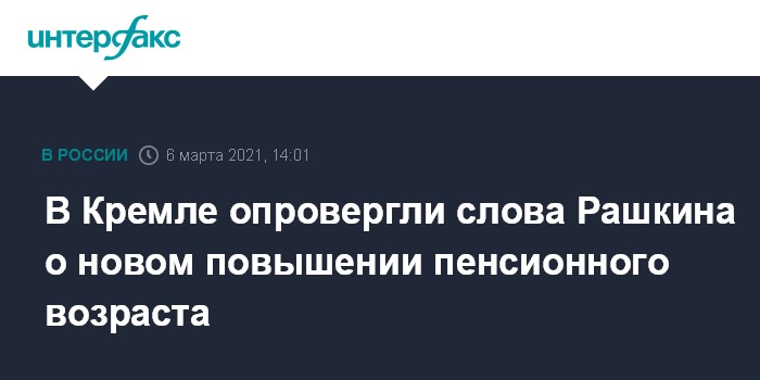 Москва. 6 марта. INTERFAX.RU - Пресс-секретарь президента РФ Дмитрий Песков опроверг заявление депутата Госдумы от КПРФ Валерия Рашкина о возможности нового повышения пенсионного возраста в России после думских выборов 2021 года.