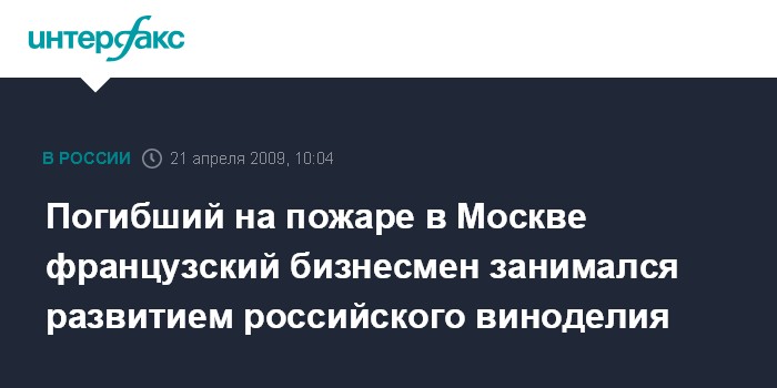 Москва. 21 апреля. INTERFAX.RU - Погибший вместе со своей семьей на пожаре в Москве французский бизнесмен занимался развитием российского виноделия, сообщил "Интерфаксу" источник в правоохранительных органах города во вторник.