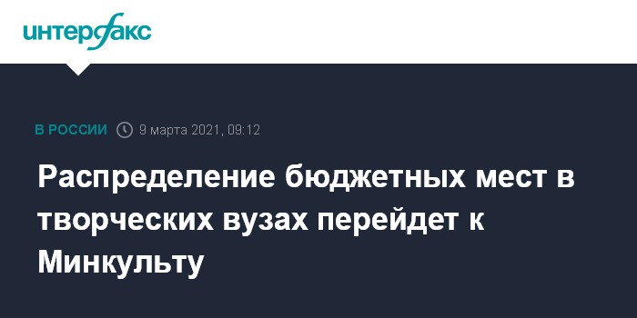 Москва. 9 марта. INTERFAX.RU - С 2022 года распределение контрольных цифр приема и бюджетных мест в творческих вузах перейдет от Министерства науки и высшего образования к Министерству культуры, сообщила "Известиям" министр культуры Ольга Любимова. С того момента ее ведомство будет решать какой вуз сколько бесплатных мест получит.