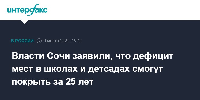 "За последние 10 лет в Сочи построено 4,5 млн кв.м. жилья, в связи с этим возникла проблема отсутствия мест в дошкольных и школьных учреждениях. Дефицит мест в школах составляет 25 тысяч, детских садах – 9 тысяч мест. Существующий дефицит покрыть можно за 25 лет", - сказал первый заместитель мэра Сочи Денис Юрковский на пресс-конференции в администрации курорта во вторник.