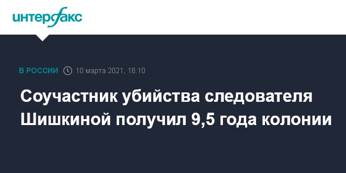 Москва. 10 марта. INTERFAX.RU - Красногорский суд приговорил к девяти годам и шести месяцам колонии общего режима фигуранта дела об убийстве следователя транспортной полиции Евгении Шишкиной в 2018 году, сообщила Генпрокуратура. Суд признал его соучастником преступления. На момент убийства он был несовершеннолетним.