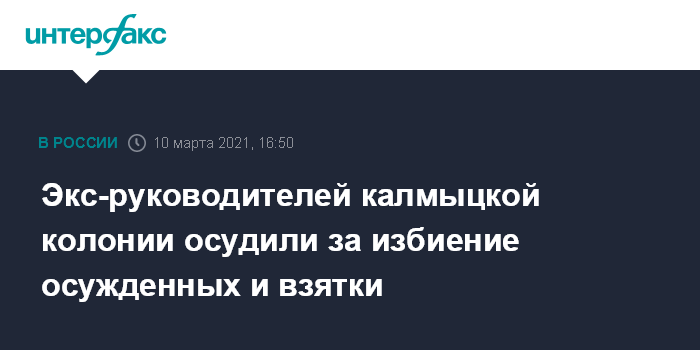 Москва. 10 марта. INTERFAX.RU - Яшкульский районный суд в Калмыкии признал виновными в превышении полномочий с применением насилия экс-начальника колонии №2 и его бывшего заместителя, которому также инкриминировали получение взятки. Об этом сообщает прокуратура республики в среду.