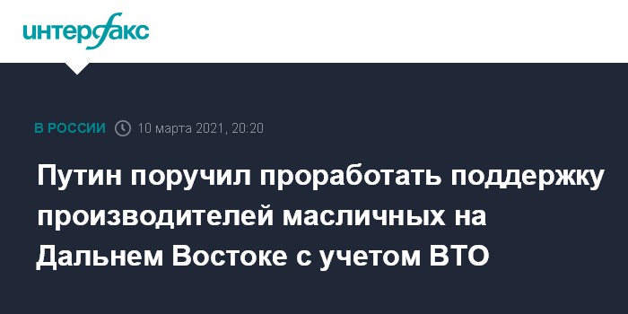 Москва. 10 марта. INTERFAX.RU - Президент Владимир Путин поручил ведомствам проработать вопрос о поддержке производителей масличных культур на Дальнем Востоке с учетом требований ВТО.