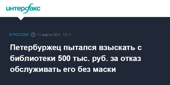 Москва. 11 марта. INTERFAX.RU - Житель Петербурга обратился в суд, чтобы взыскать компенсацию морального вреда в полмиллиона рублей с библиотеки, где его отказались обслуживать из-за отсутствия маски и перчаток.