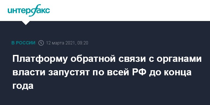 Москва. 12 марта. INTERFAX.RU - Платформа обратной связи (ПОС) "Госуслуги. Решаем вместе", которая создается по поручению президента России Владимира Путина, до конца 2021 года будет внедрена во всех субъектах РФ, региональных и муниципальных органах власти, а также в ряде федеральных органов исполнительной власти.