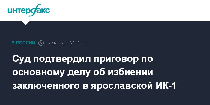Москва. 12 марта. INTERFAX.RU - Ярославский областной суд оставил без изменения приговор 11 сотрудникам исправительной колонии №1 Ярославля делу об избиении заключенного Евгения Макарова летом 2017 года. Об этом сообщил фонд "Общественный вердикт" (Минюст считает организацию иноагентом), представляющий интересы потерпевших.