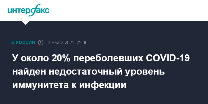 "По имеющимся на сегодняшний момент данным наших китайских коллег, которые на очень большой выборке исследовали этот вопрос - на населении КНР - до 20% переболевших не имеют достаточного уровня защитных антител. Это довольно-таки большое количество людей" - сказал Гинцбург в эфире YouTube- канала "Соловьев LIVE" в субботу.
