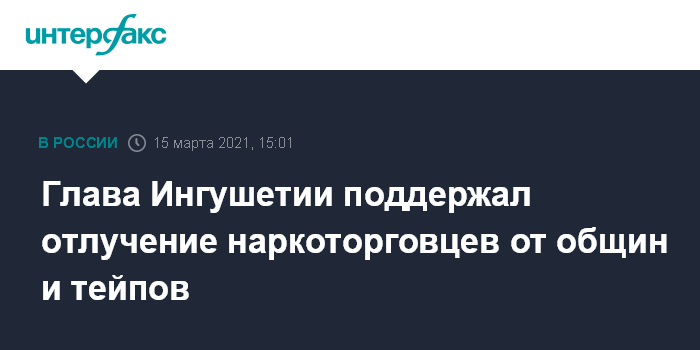 Москва. 15 марта. INTERFAX.RU - Глава Ингушетии Махмуд-Али Калиматов поддержал отлучение распространителей наркотиков от тейпов и мусульманских общин эффективным способом борьбы с наркоторговлей в республике. В начале февраля такое решение приняло ингушское духовенство на собрании в Назрани.