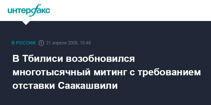 Москва. 21 апреля. INTERFAX.RU - В Тбилиси после праздничных Пасхальных дней во вторник возобновился на площади перед парламентом митинг сторонников оппозиции, в котором на этот час участвуют более 10 тысяч человек. Единственное требование оппозиции - отставка президента Михаила Саакашвили и назначение досрочных президентских выборов - остается в силе.