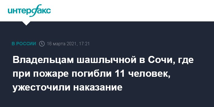 Москва. 16 марта. INTERFAX.RU - Краснодарский краевой суд ужесточил приговор владельцам шашлычной в Сочи по делу о пожаре, жертвами которого стали 11 человек.