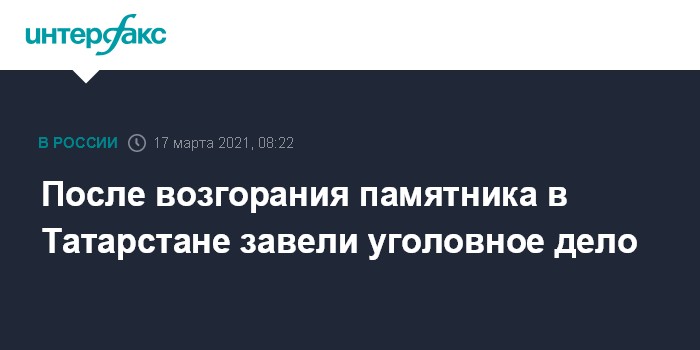Москва. 17 марта. INTERFAX.RU - Следователи в Татарстане возбудили уголовное дело в отношении неустановленных лиц по факту возгорания в городе Заинск памятника Воину-освободителю, сообщил журналистам старший помощник прокурора республики по взаимодействию со СМИ Руслан Галиев в среду.