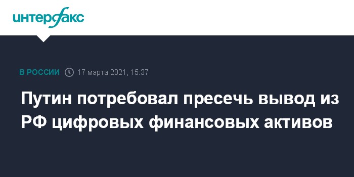 Москва. 17 марта. INTERFAX.RU - Президент России Владимир Путин поставил перед Генпрокуратурой задачу не допустить вывод из страны цифровых финансовых активов.