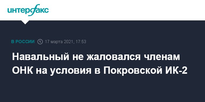 Москва. 17 марта. INTERFAX.RU - Политик Алексей Навальный не жалуется на условия содержания в исправительной колонии №2 в Покрове, рассказал член Общественной наблюдательной комиссии Владимирской области Сергей Яжан.