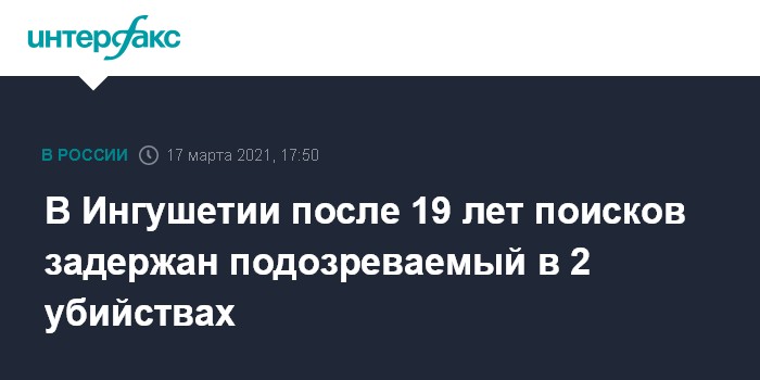 Москва. 17 марта. INTERFAX.RU - Правоохранительные органы Ингушетии задержали местного жителя, подозреваемого в двойном убийстве 19-летней давности, сообщили "Интерфаксу" в пресс-службе СУ СКР по региону.
