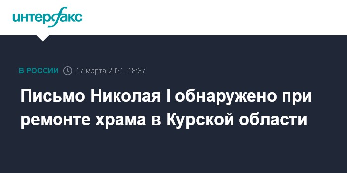 Москва. 17 марта. INTERFAX.RU - Письмо, написанное Николаем I, обнаружили в Христорождественском храме села Шатовка Фатежского района Курской области во время проведения ремонтных работ, сообщает пресс-служба обладминистрации.