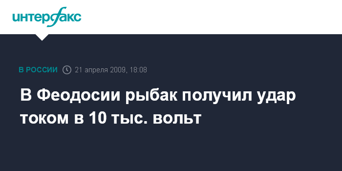 Симферополь. 21 апреля. INTERFAX.RU - В Феодосии рыбак получил ожоги более половины кожного покрова после удара электрическим разрядом напряжением в 10 тыс. вольт.