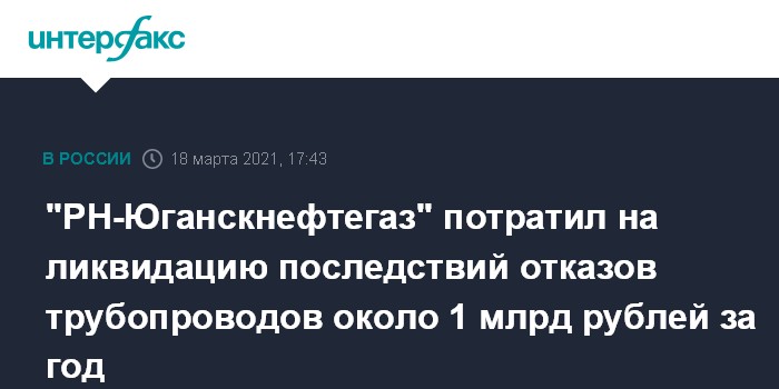 Москва. 18 марта. INTERFAX.RU - ООО "РН-Юганскнефтегаз", крупнейшее нефтедобывающее предприятие "Роснефти", в 2020 году направило 943,5 млн рублейна локализацию и ликвидацию последствий отказов трубопроводов 943,5 млн рублей, говорится в пояснении к годовой бухгалтерской отчетности этой компании.