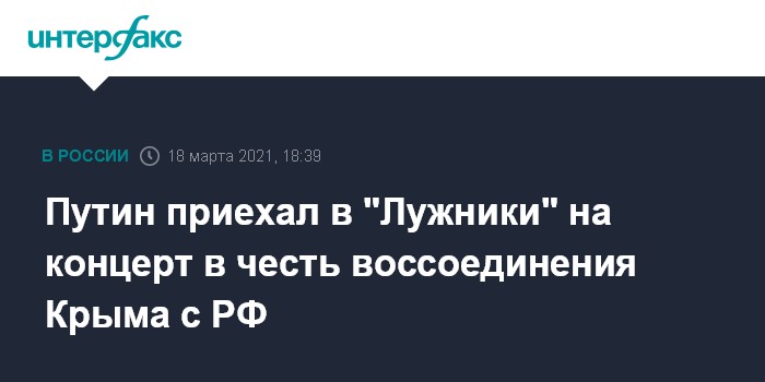 Москва. 18 марта. INTERFAX.RU - Президент РФ Владимир Путин пришел на праздничный концерт в московских Лужниках, посвященный седьмой годовщине воссоединения Крыма с Россией.