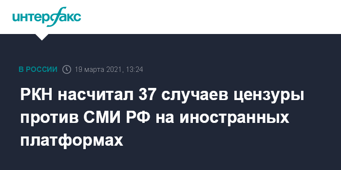 Москва. 19 марта. INTERFAX.RU - Роскомнадзор зафиксировал 37 случаев цензуры со стороны иностранных интернет-платформ в отношении материалов российских СМИ. Об этом заявил начальник управления контроля и надзора в сфере электронных коммуникаций Роскомнадзора Евгений Зайцев.