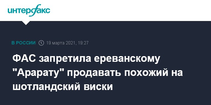 Москва. 19 марта. INTERFAX.RU - Федеральная антимонопольная служба (ФАС) потребовала от Ереванского коньячно-винно-водочного комбината "Арарат" (Армения) прекратить использование шотландских элементов в оформлении виски Mac Ingal или его реализацию.