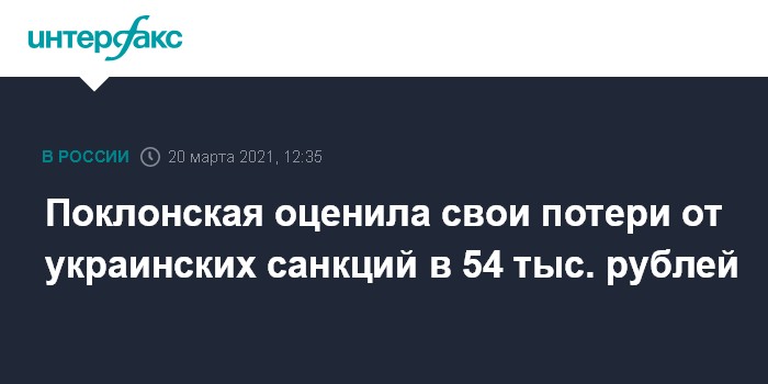 Москва. 20 марта. INTERFAX.RU - Около 20 тысяч гривен (порядка 54 тысяч рублей) остаются заблокированными на старой украинской карточке депутата Госдумы Натальи Поклонской в результате санкций, введенных Советом национальной безопасности и обороны (СНБО) Украины.