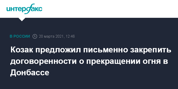 Москва. 20 марта. INTERFAX.RU - Заместитель главы администрации президента РФ Дмитрий Козак предложил коллегам по переговорам политсоветников "нормандского формата" письменно закрепить договоренности, способствующие выполнению сторонами конфликта в Донбассе обязательств по прекращению огня.