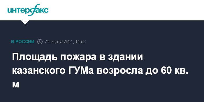 Москва. 21 марта. INTERFAX.RU - Площадь пожара в здании ГУМа в историческом центре Казани, по уточненным данным, составляет шестьдесят квадратных метров, сообщила в воскресенье пресс-служба ГУ МЧС РФ по Татарстану.