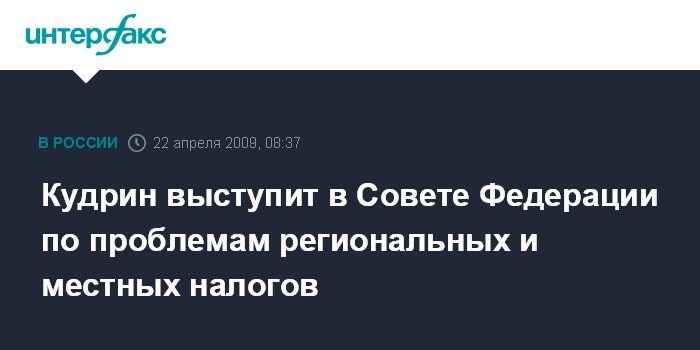 Москва. 21 апреля. INTERFAX.RU – Совет Федерации на заседании в среду намерен заслушать вице-премьера, министра финансов РФ Алексея Кудрина, который проинформирует о проблемах, связанных с администрированием региональных и местных налогов, сообщили "Интерфаксу" в пресс-службе верхней палаты парламента.