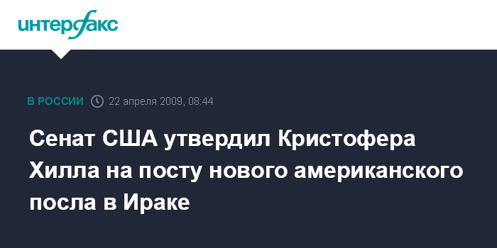 Москва. 21 апреля. INTERFAX.RU – Бывший руководитель американской переговорной группы на шестисторонних переговорах по урегулированию ядерного кризиса на Корейском полуострове Кристофер Хилл назначен на должность нового посла США в Ираке.