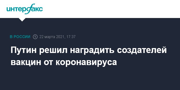 Москва. 22 марта. INTERFAX.RU - Президент Владимир Путин поручил представить к госнаградам всех причастных к разработкам российских вакцин от коронавируса и поощрить их материально. Он сказал это на совещании по вакцинации 22 марта.