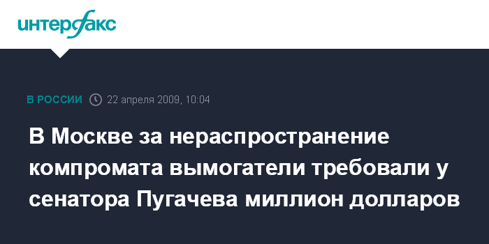 Источник в окружении Пугачева подтвердил "Интерфаксу" данную информацию. Собеседник агентства пояснил, что вымогатели требовали деньги за якобы блокирование на федеральных телеканалах информации, порочащей честь и достоинство сенатора.