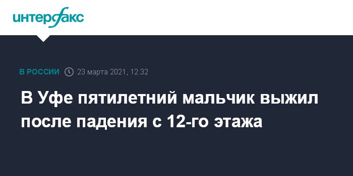 Москва. 23 марта. INTERFAX.RU - Пятилетний мальчик в Уфе госпитализирован после падения из окна квартиры на 12-м этаже, сообщила пресс-служба регионального следственного управления СКР.