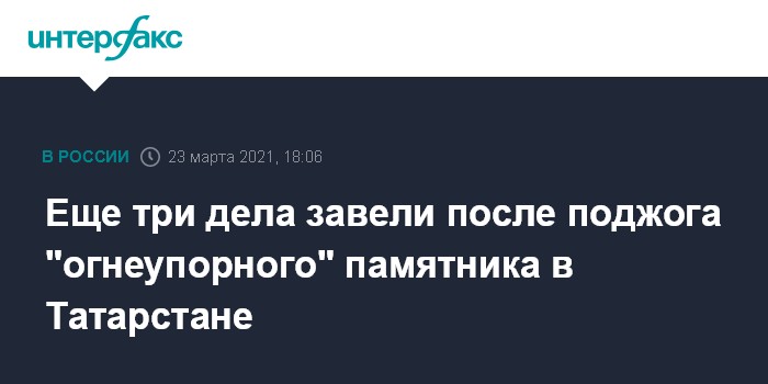 Москва. 23 марта. INTERFAX.RU - Следователи в Татарстане возбудили еще три уголовных дела по факту возгорания в городе Заинске "огнеупорного" памятника Воину-освободителю. Об этом сообщает пресс-служба СУ СКР по республике во вторник.