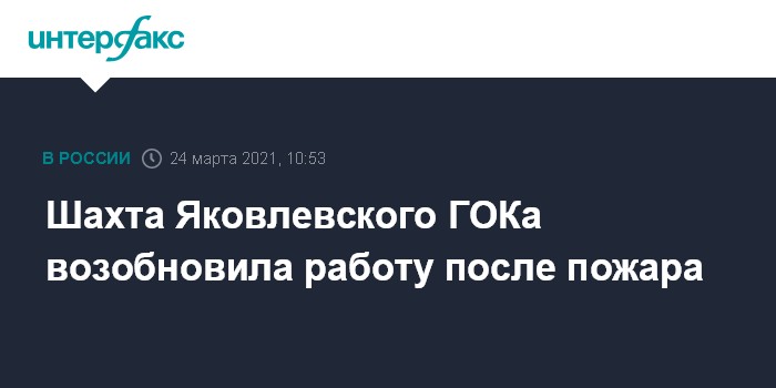 Москва. 24 марта. INTERFAX.RU - В Белгородской области возобновила работу шахта рудника Яковлевского ГОКа (ООО "Корпанга", входит в "Северсталь"), сообщили в пресс-службе комбината. 21 марта утром в шахте загорелся проходческий комбайн.