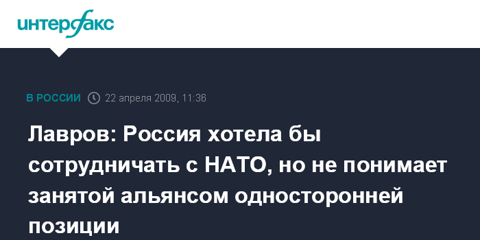 Москва. 22 апреля. INTERFAX.RU - Глава МИД РФ Сергей Лавров обвинил членов НАТО в возврате "к конфронтационной логике "холодной войны", подчеркнув, однако, что НАТО не рассматривается однозначно российской стороной как источник угрозы.