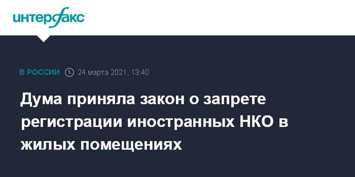 Москва. 24 марта. INTERFAX.RU - Госдума в среду приняла в третьем, окончательном чтении закон, уточняющий порядок работы иностранных некоммерческих организаций на территории РФ, в частности, запрещающий регистрировать подразделения НКО в жилых помещениях.