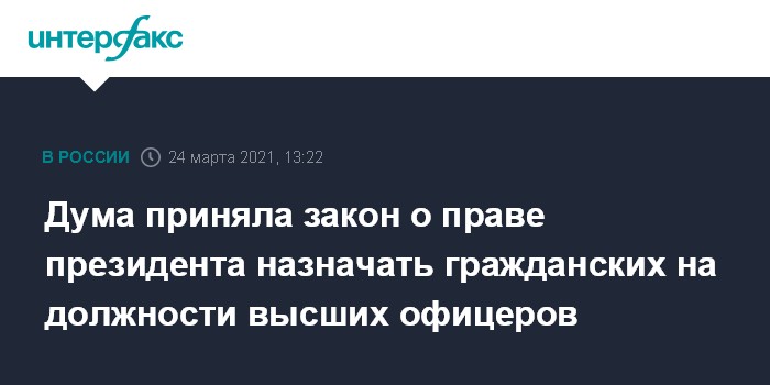 Москва. 24 марта. INTERFAX.RU - Государственная Дума приняла в третьем, окончательном чтении закон, который вводит единый порядок назначения президентом России граждан, не являющихся военнослужащими, на должности высших офицеров в силовых ведомствах.