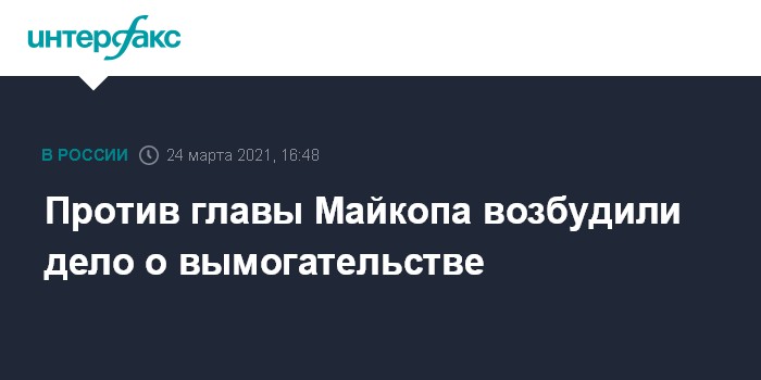Москва. 24 марта. INTERFAX.RU - Уголовное дело о вымогательстве возбуждено против главы администрации Майкопа, сообщает пресс-служба управления СК РФ по Адыгее.