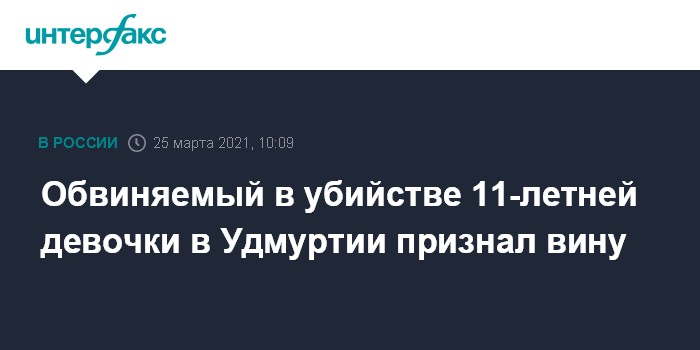 Москва. 25 марта. INTERFAX.RU - Житель Сарапула, обвиняемый в убийстве 11-летней девочки, признал свою вину, сообщает пресс-служба СКР в четверг.