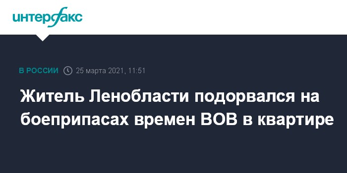 Москва. 25 марта. INTERFAX.RU - В Кировском районе Ленинградской области местный житель пострадал в результате неосторожного обращения с патронами, сообщил "Интерфаксу" в четверг информированный источник.