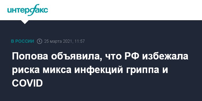 Москва. 25 марта. INTERFAX.RU - Россия избежала риска микст-инфекции гриппа и коронавируса, сообщила глава Роспотребнадзора Анна Попова.