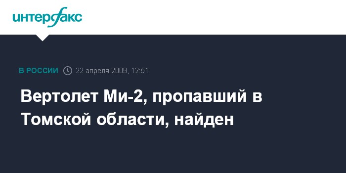 Москва. 22 апреля. INTERFAX.RU - Пропавший в Томской области вертолет Ми-2 компании "Сибавиатрейд" (Красноярск), обнаружен, сообщили агентству "Интерфакс-Сибирь" в Сибирском региональном координационном центре поиска и спасения Росаэронавигации.