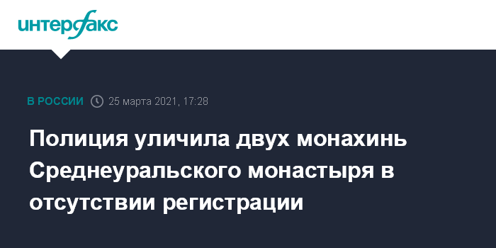 Москва. 25 марта. INTERFAX.RU - На двух монахинь Среднеуральского женского монастыря полицейские составили административные протоколы об отсутствии регистрации, сообщил "Интерфаксу" Павел Бабиков - адвокат бывшего духовника обители Сергия (Романова).