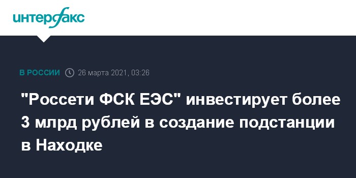 Москва. 26 марта. INTERFAX.RU - "Россети ФСК ЕЭС" (ПАО "ФСК ЕЭС") приступили к строительству подстанции 220 кВ "Находка" в Приморском крае стоимостью более 3 млрд рублей, сообщается на официальном сайте компании.