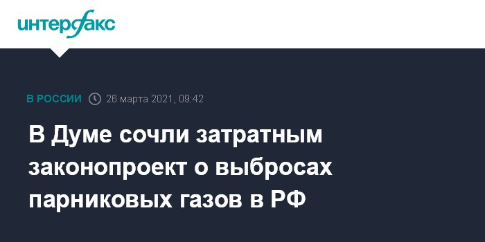 Как сообщалось, в феврале правительство РФ внесло в Госдуму законопроект "Об ограничении выбросов парниковых газов", он вводит обязательную отчетность ряда компаний о выбросах, прописывает основы стимулирования деятельности по реализации климатических проектов, но не предусматривает лимитирующие меры для бизнеса - отсутствуют квоты и плата за выбросы. При этом предполагается создание контуров национальной системы торговли углеродными выбросами, планируется налоговое стимулирование реализации экологических проектов.