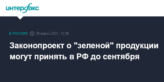 Москва. 26 марта. INTERFAX.RU - Законопроект о продукции с улучшенными характеристиками ("зеленая" продукция) будет принят в этом году, до сентября, прогнозируют в Минсельхозе.